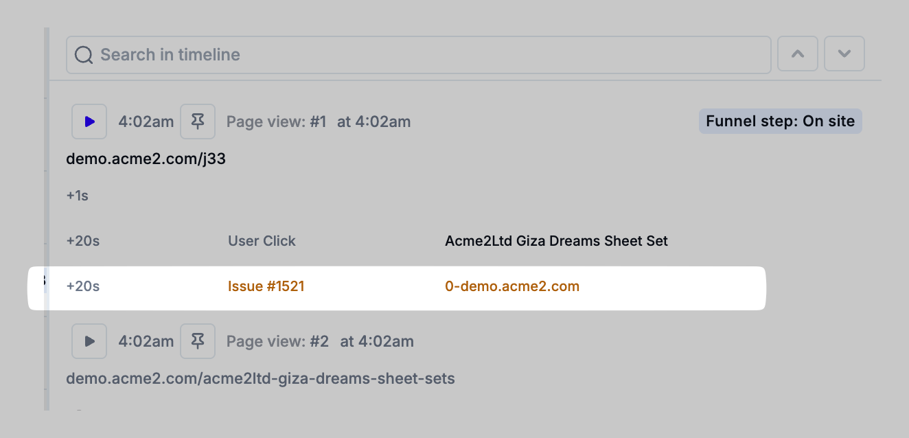 The Timeline tracks every event captured in the session video, with timestamps associated to each major action. This could include user interactions like clicks, keyboard inputs, on-screen errors, and more.