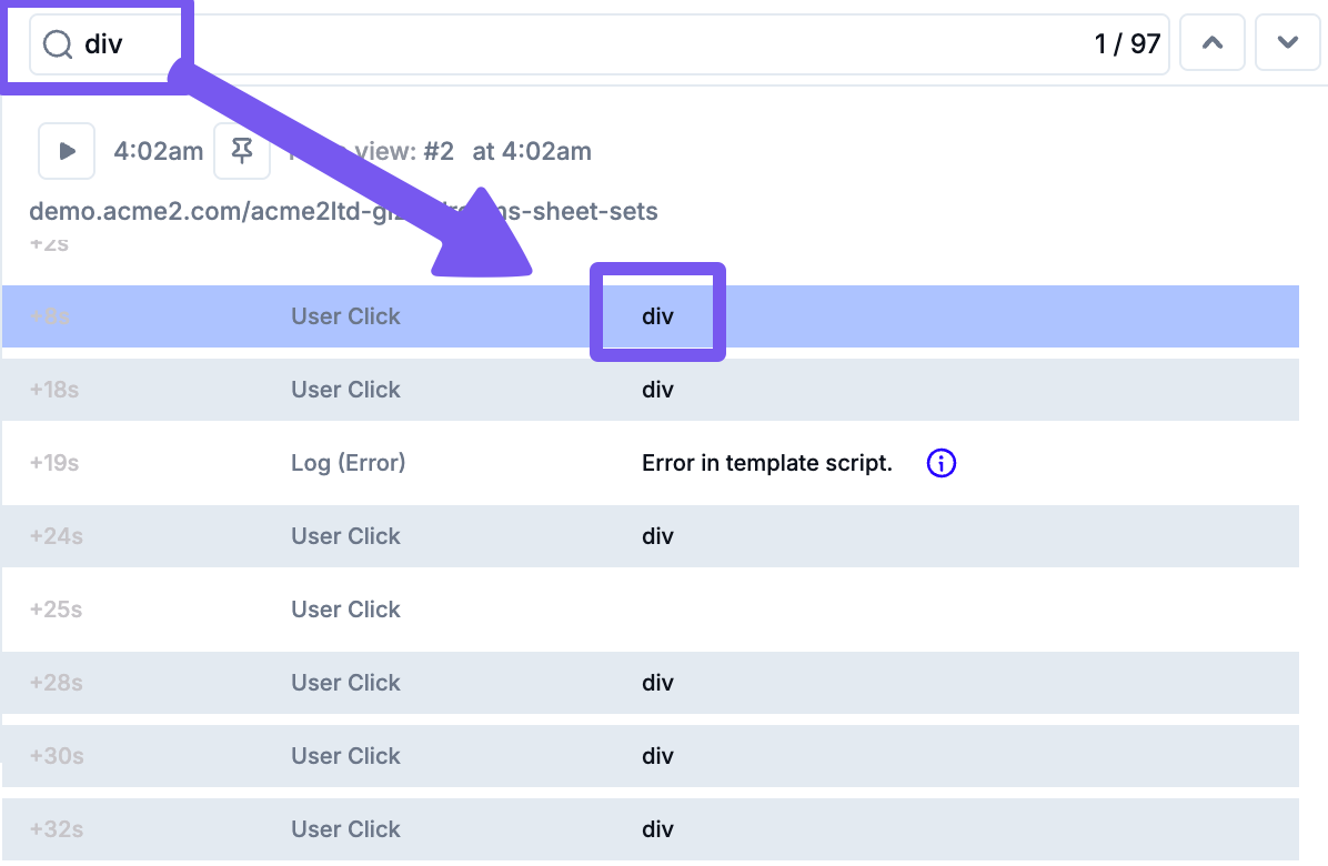 Below the session timeline toggles is a search field, which allows you to find specific rows within the session timeline. This allows you to find specific HTTP events, user clicks, URLs, symptoms, and more. Rows in the timeline that match your search will be highlighted accordingly.