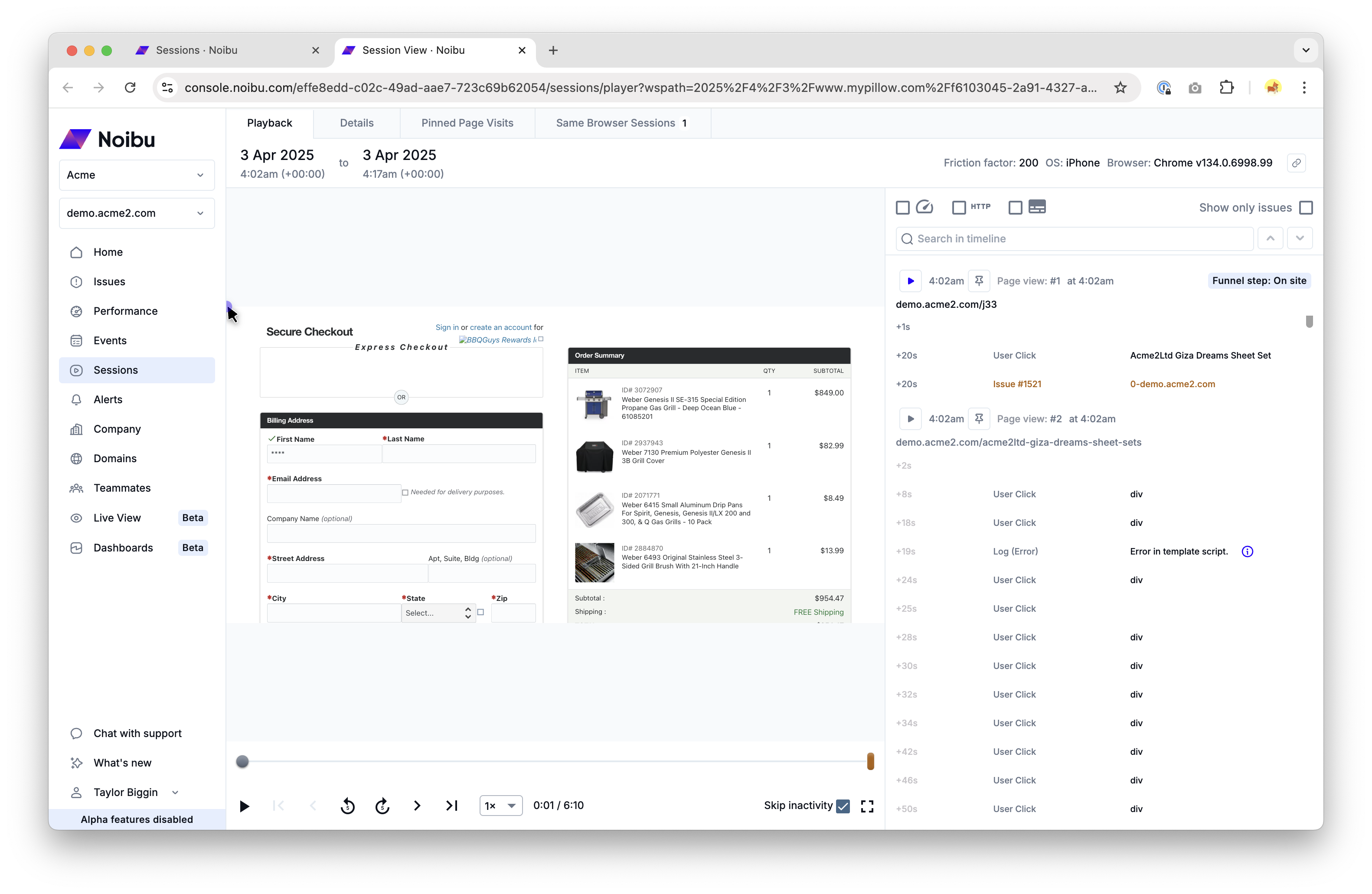 Session replays are essential for diagnosing errors in Noibu. A video of an error occurring gives unique insight into the customer experience, and may help you identify the step, field, button, or process that triggers the error. From there, you can examine your user logs and source code to uncover the error's cause.