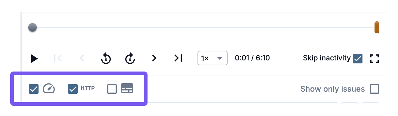 By default, the session replay timeline does not display core web vitals, page lifecycle events, HTTP events. You can enable each of these by checking the relevant box.